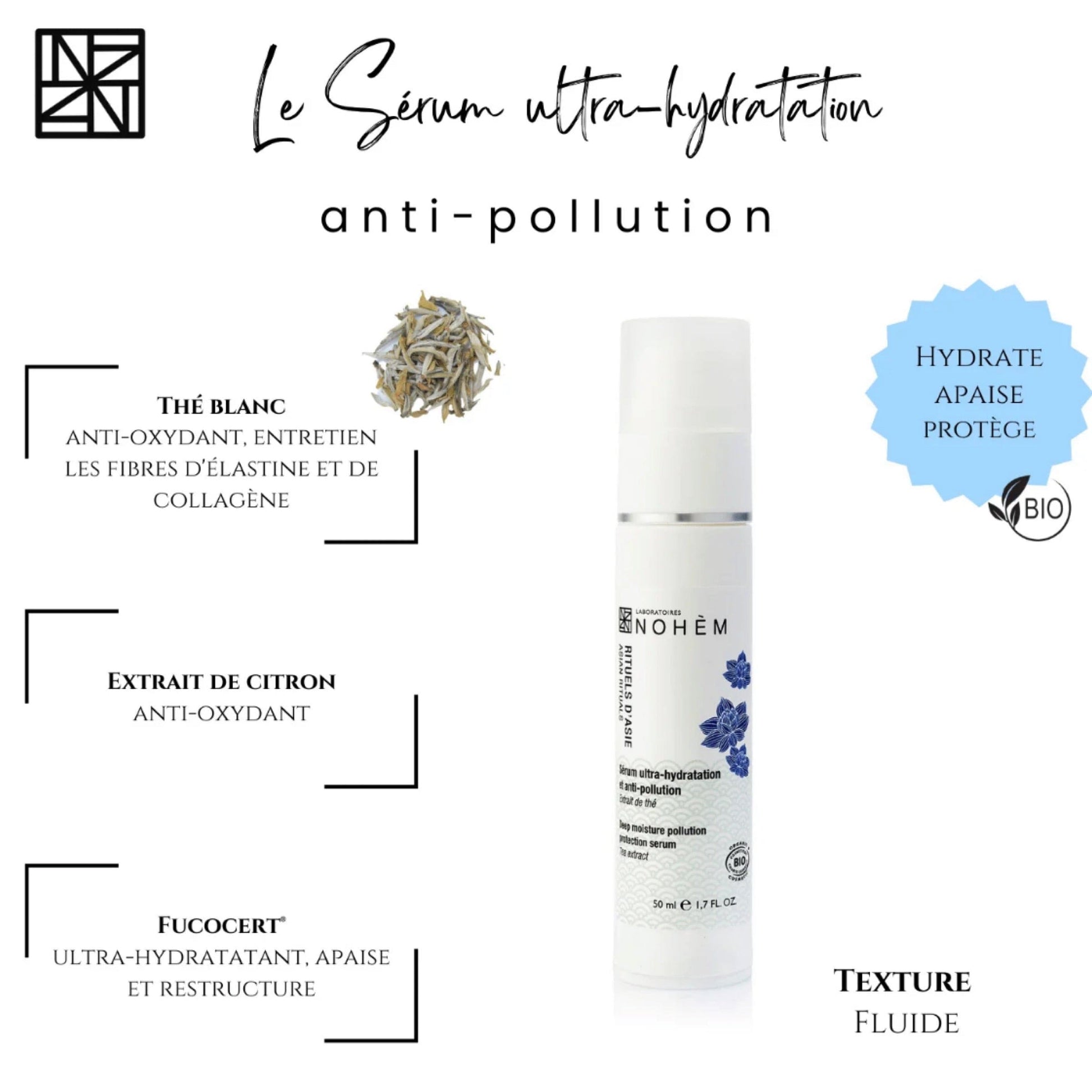 NOHÈM Deep Moisture Pollution Protection Serum is a true hydrating elixir that is quickly absorbed leaving the skin intensely moisturized, smooth and radiant.