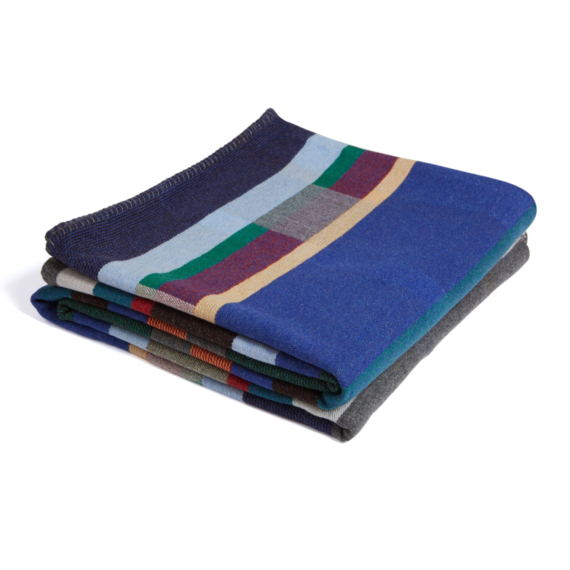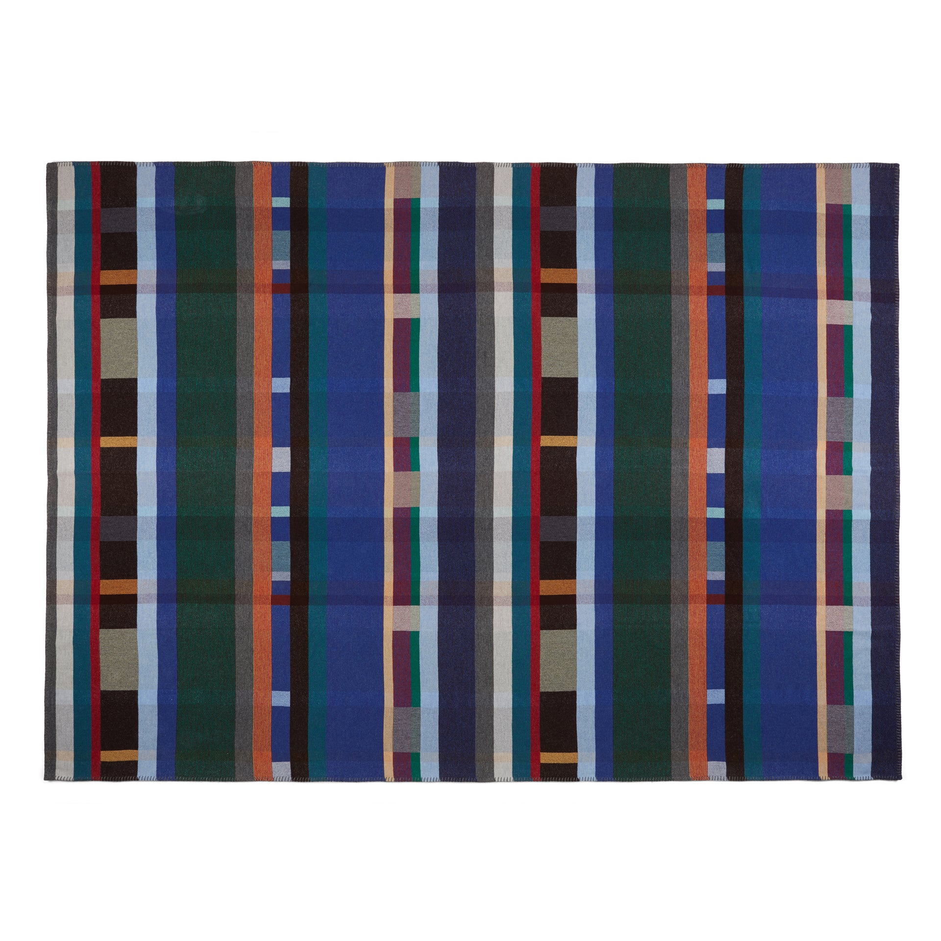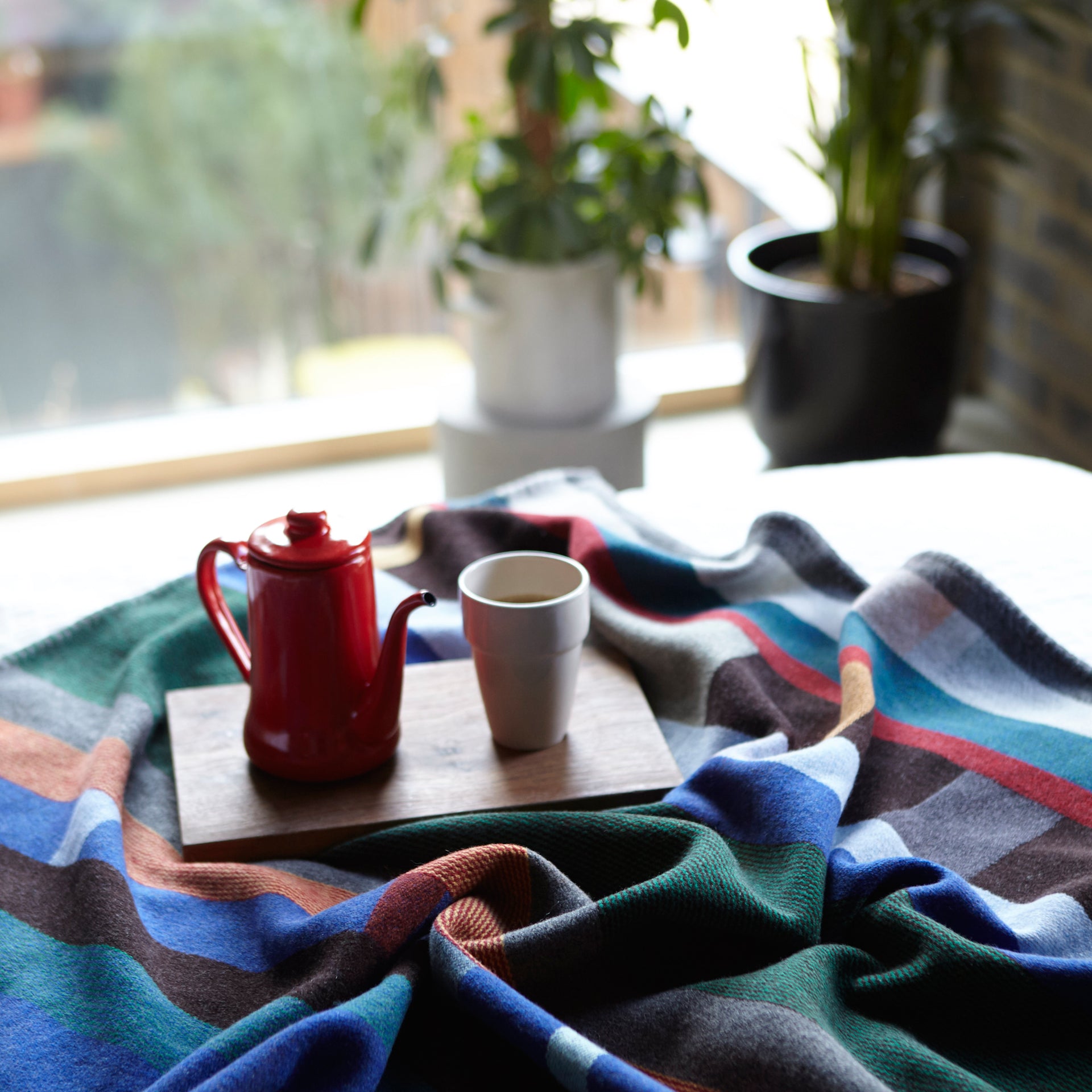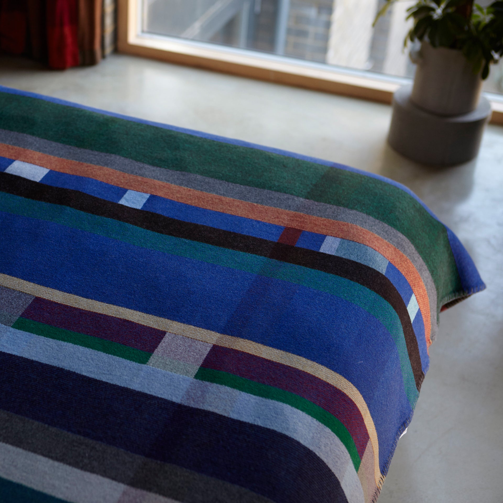 The Antoni throw features a dynamic overlay of coloured bands. Carefully selected to create the illusion of tonal depth. Woven with sumptuous merino lambs wool and felted to create a super soft, inviting quality. Beautifully finished with blanket stitches, which adds an extra tactile detail to all its edges. This bold and contemporary design will be a colourful and uplifting addition to any home.