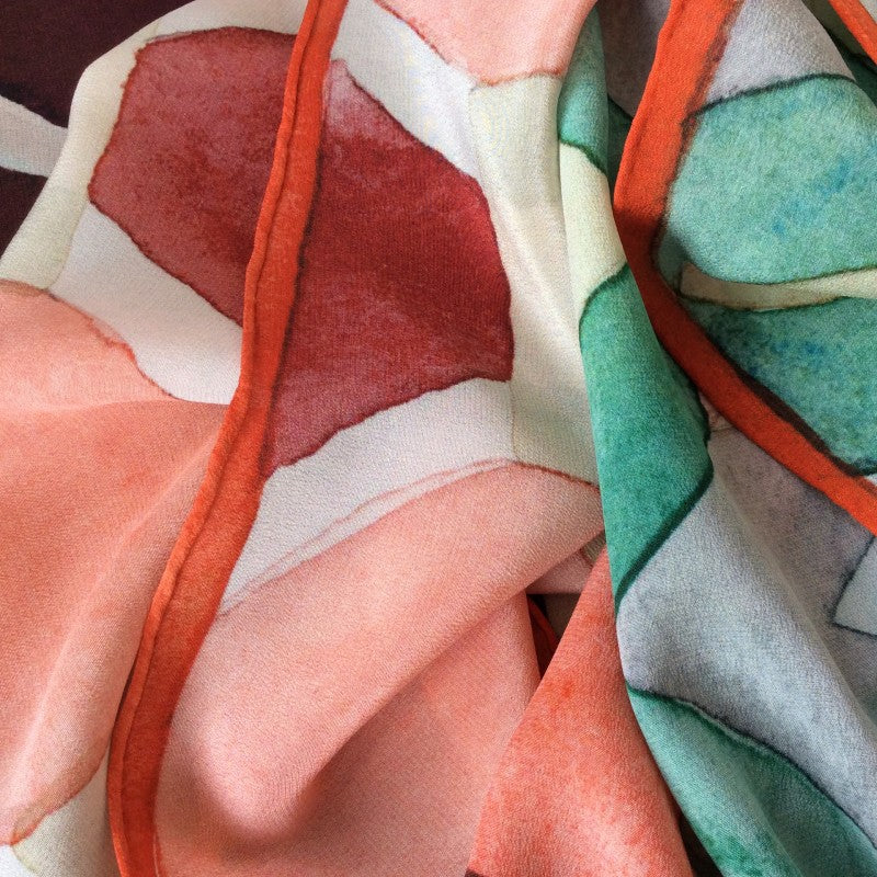 These bright and vibrant compositions are hand painted by the two founders, Emma and Harriet. Inspired by micro details from their iconic woven patterns, they feature delicate brushstrokes of beautifully blended colours. With a delicate drape, these scarves come in varying sizes and are printed on lightweight silk crepe de chine.