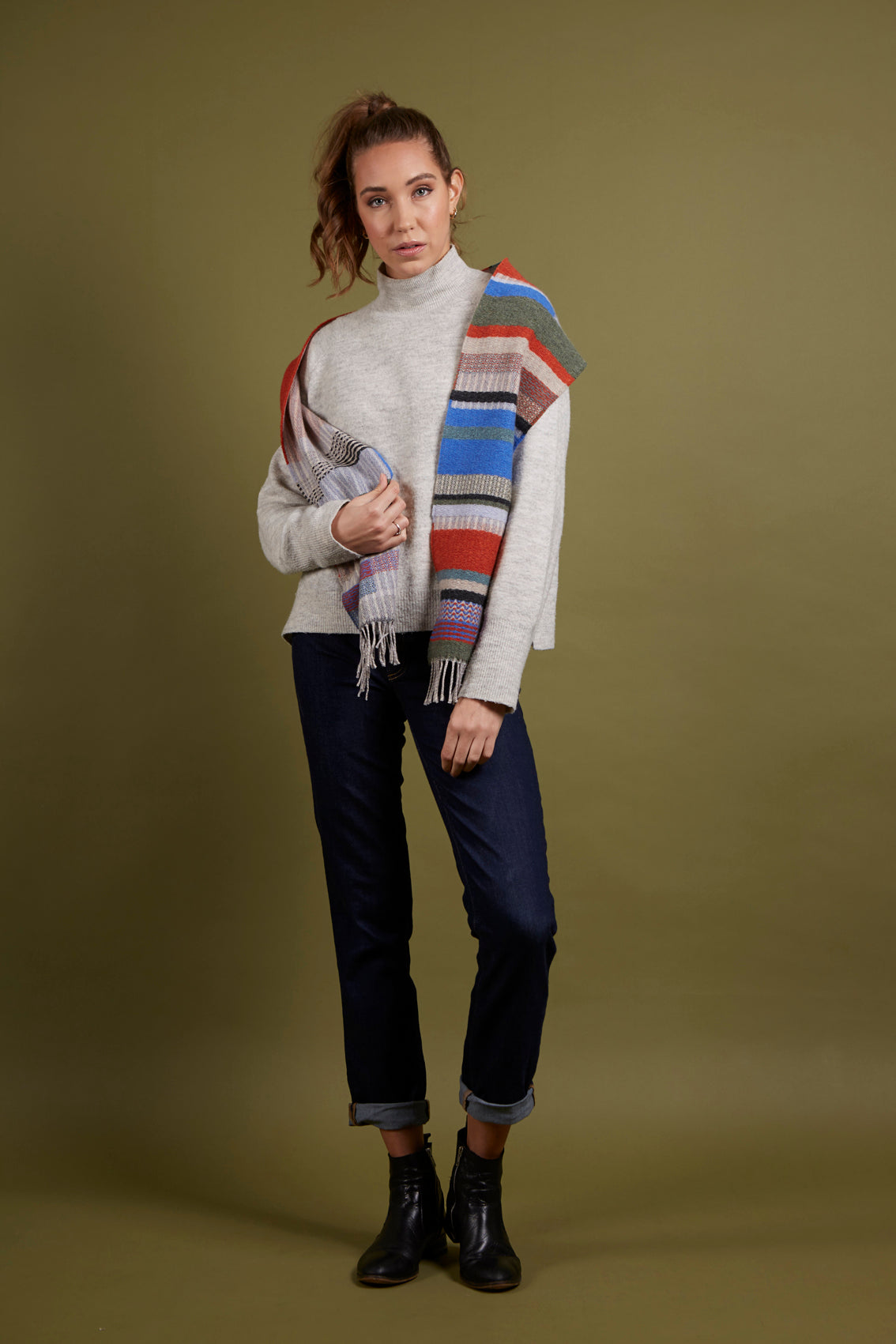 This double sided, bold and contemporary scarf is composed of defined aysmmetrical stripes and zig-zagging twills. Made of super soft merino lambswool, they have beautifully smooth finish.