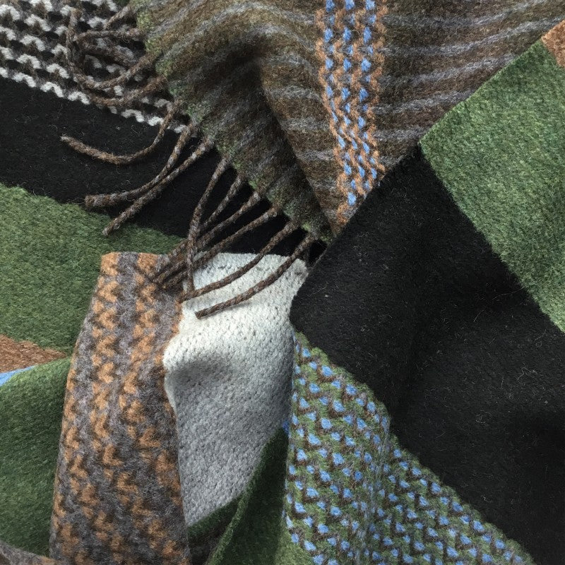 The double-sided Osaka design features sections of block colour, paired with contrasting areas of detailed twill, which combine to create a bold, modern aesthetic. Woven in merino lambs wool, the scarves have a super soft, smooth finish.