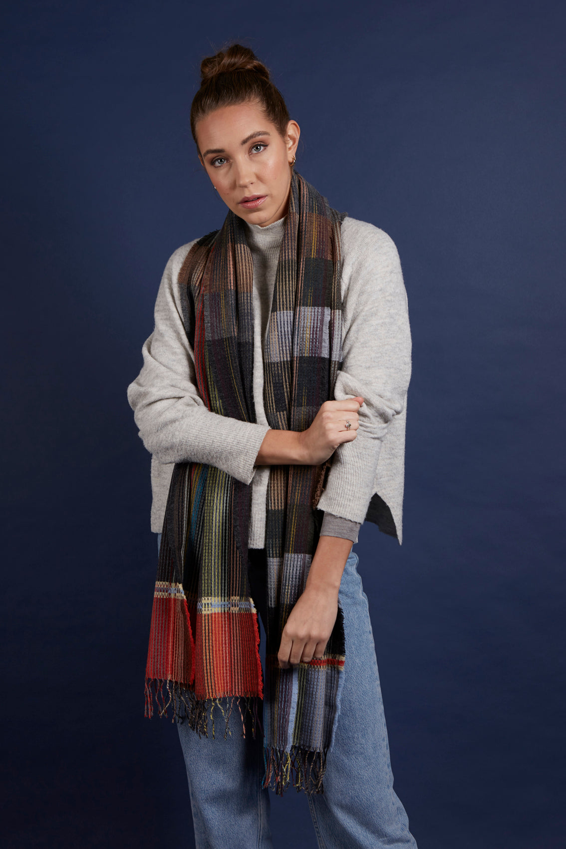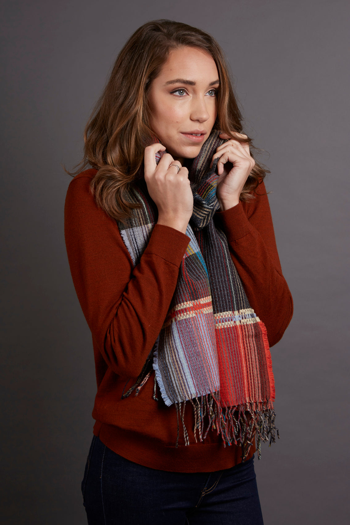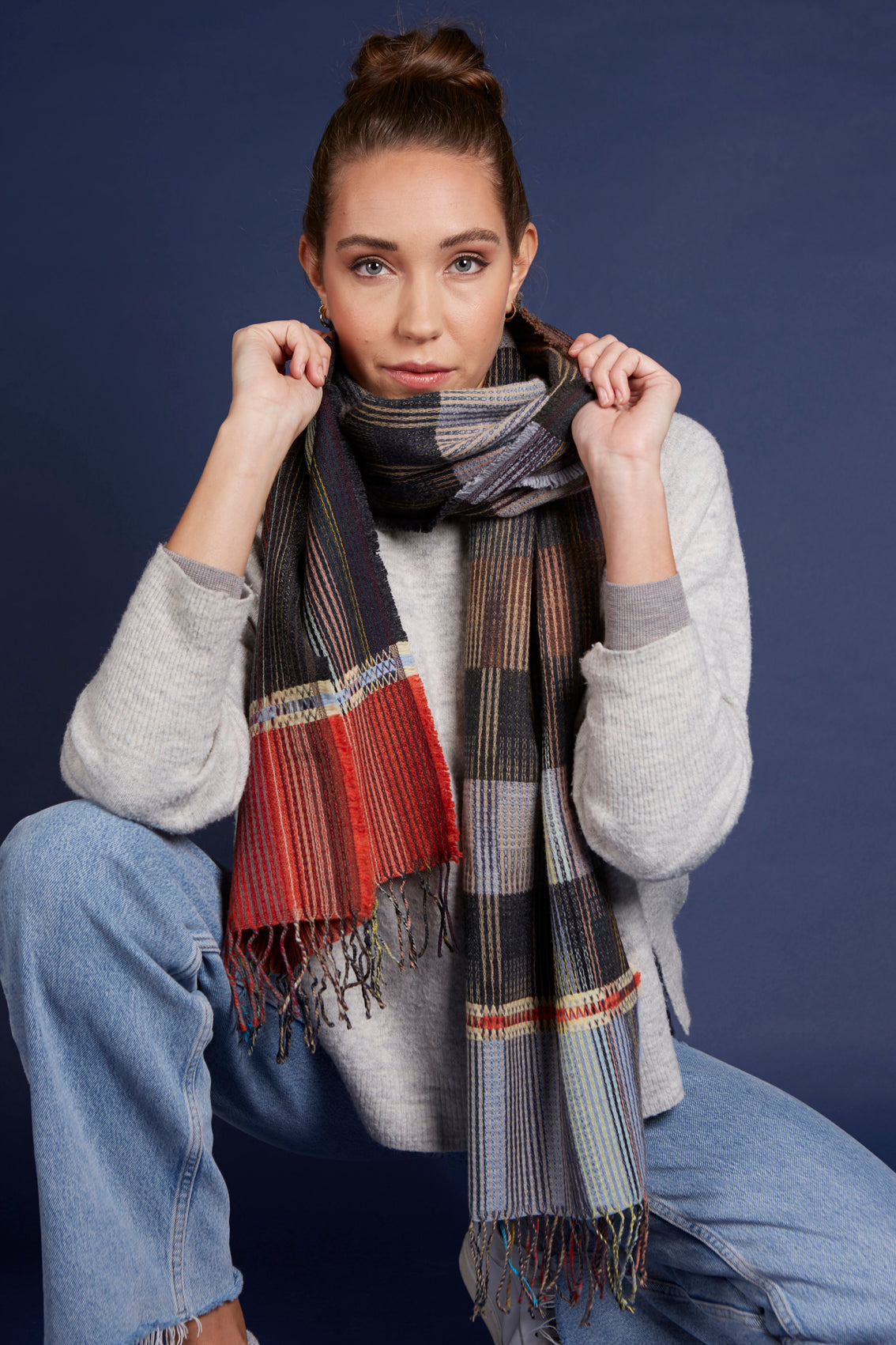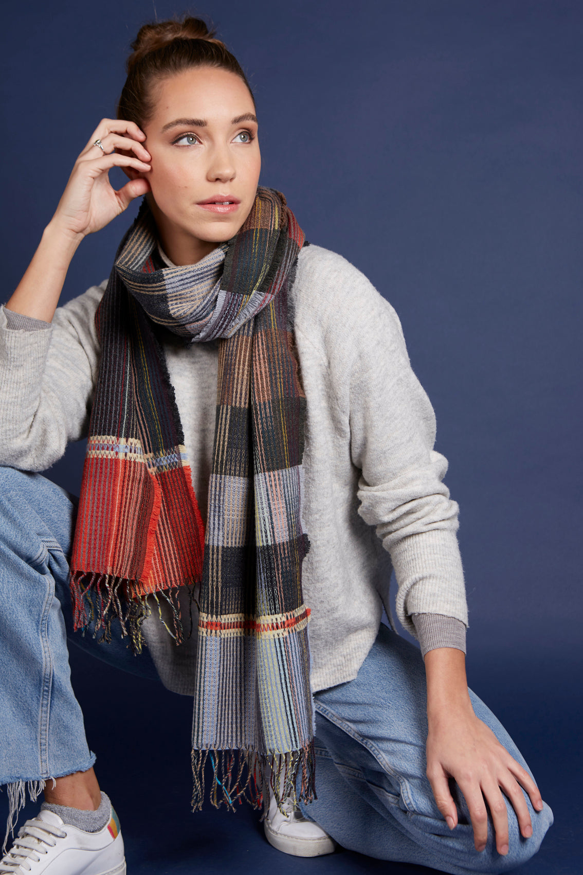 A wide width scarf, woven with super soft lambs wool; it can be wrapped twice round the neck, perfect for keeping warm and cosy. The design incorporates Wallace Sewell's signature pinstripe weave, using subtle alternating bands to form a beautiful interchanging linear pattern, finished at either end with a tassel fringe.